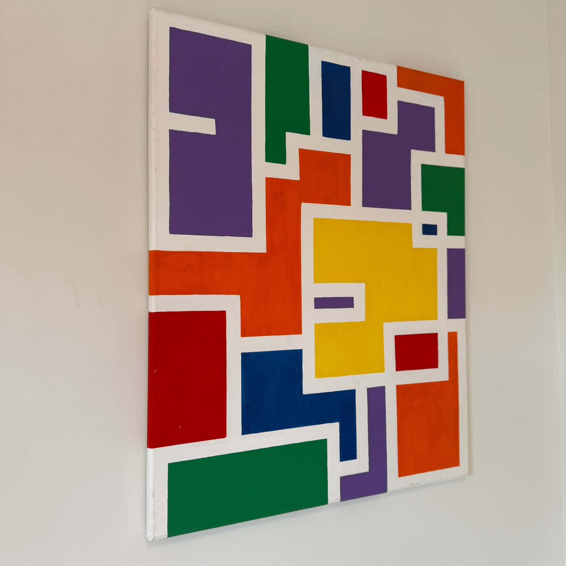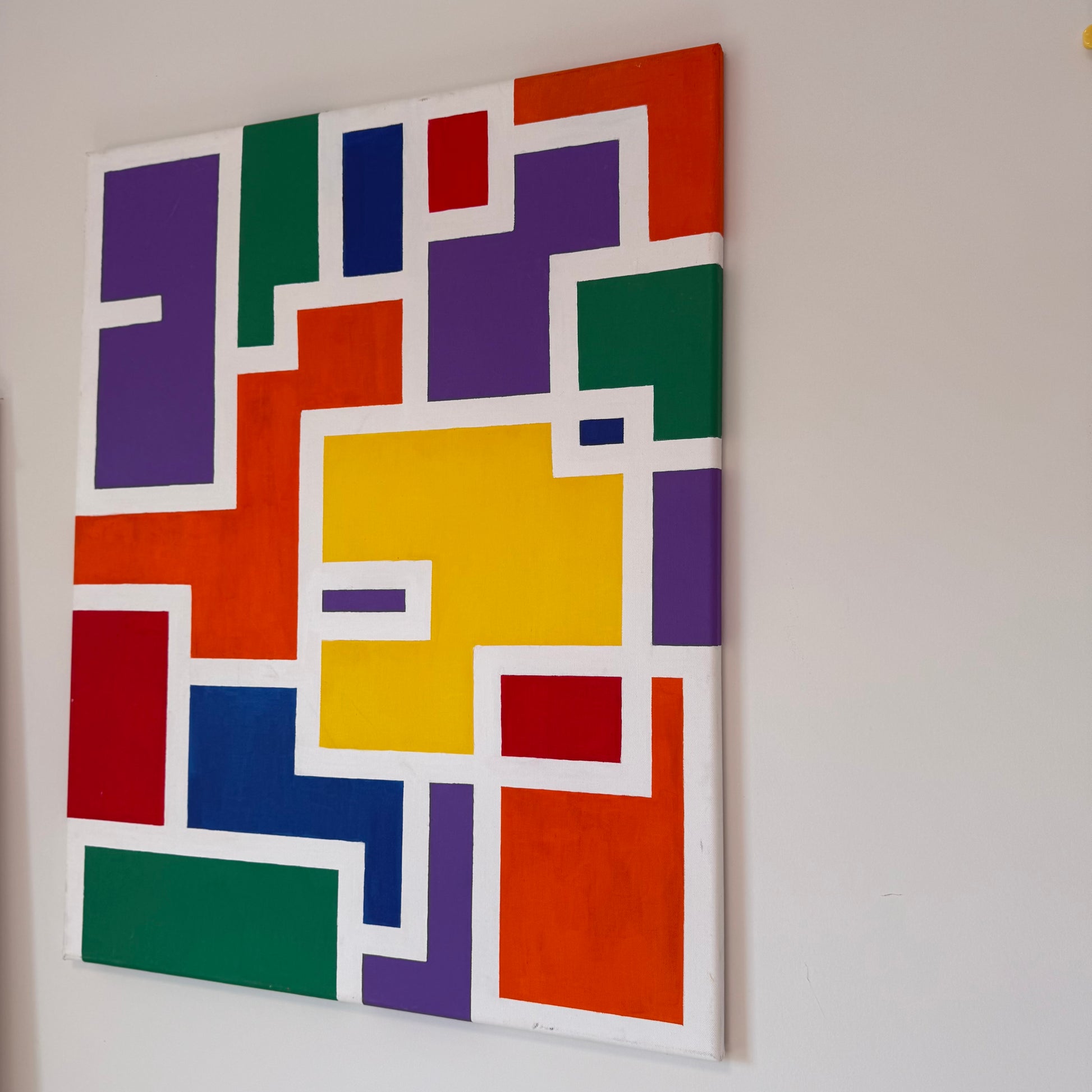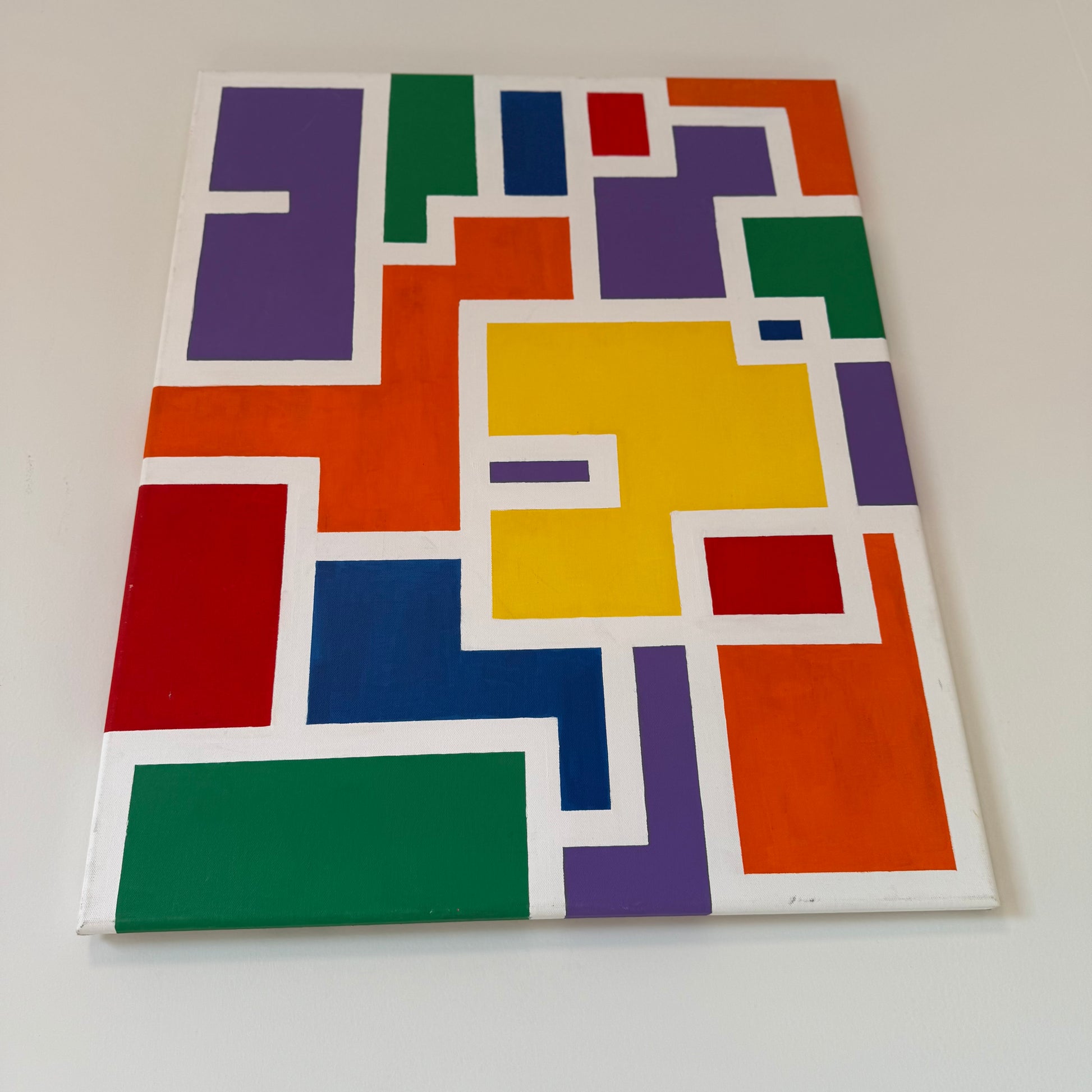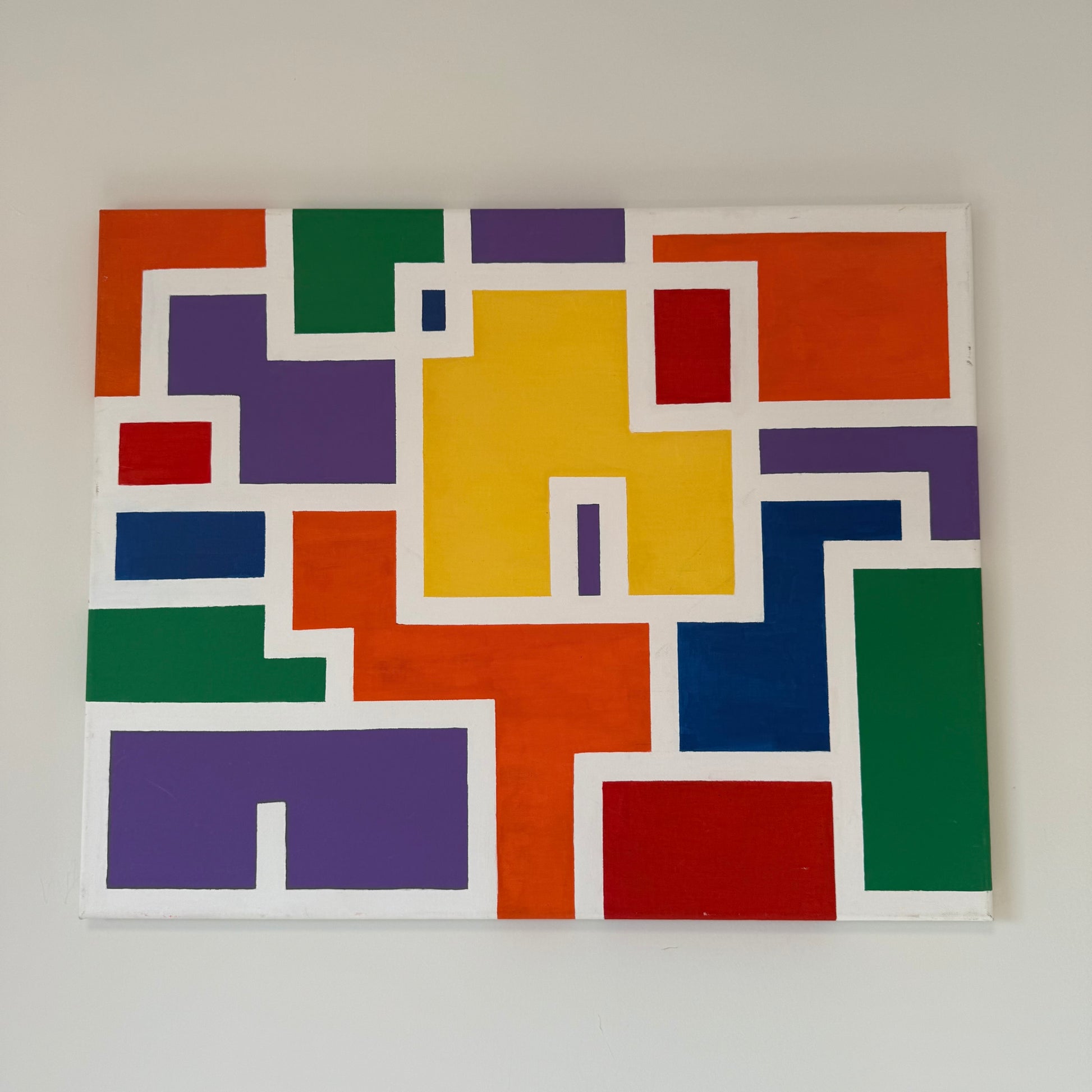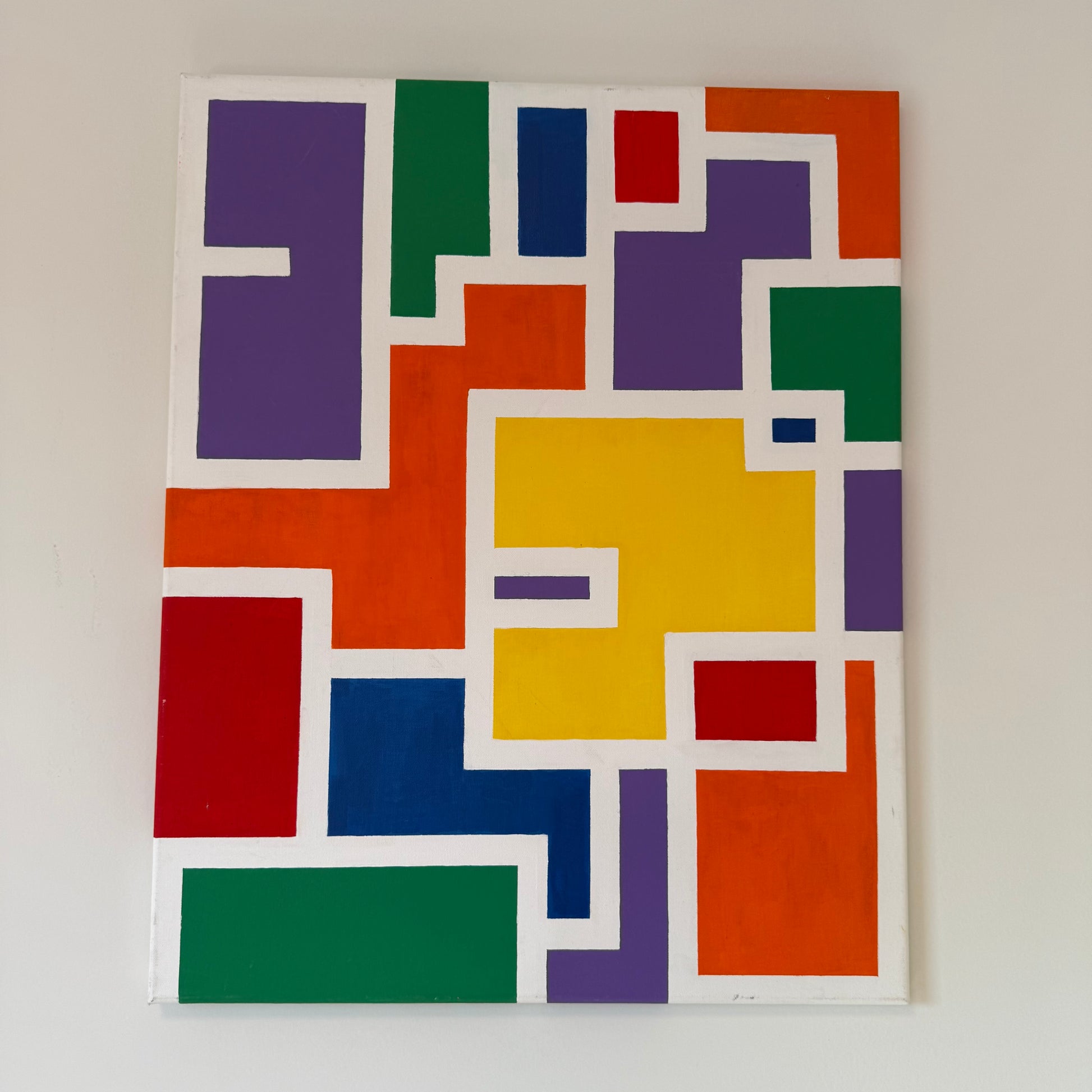The first piece created after returning from a summer in London, London Elements is infused with the energy of the city that inspires me most. Days spent painting, resting, and wandering the halls of the Tate Modern rekindled my creativity, leading to this bold interplay of color and form. Each shape represents a fragment of that experience — food shared, art admired, streets explored — coming together in harmony, much like the city itself.