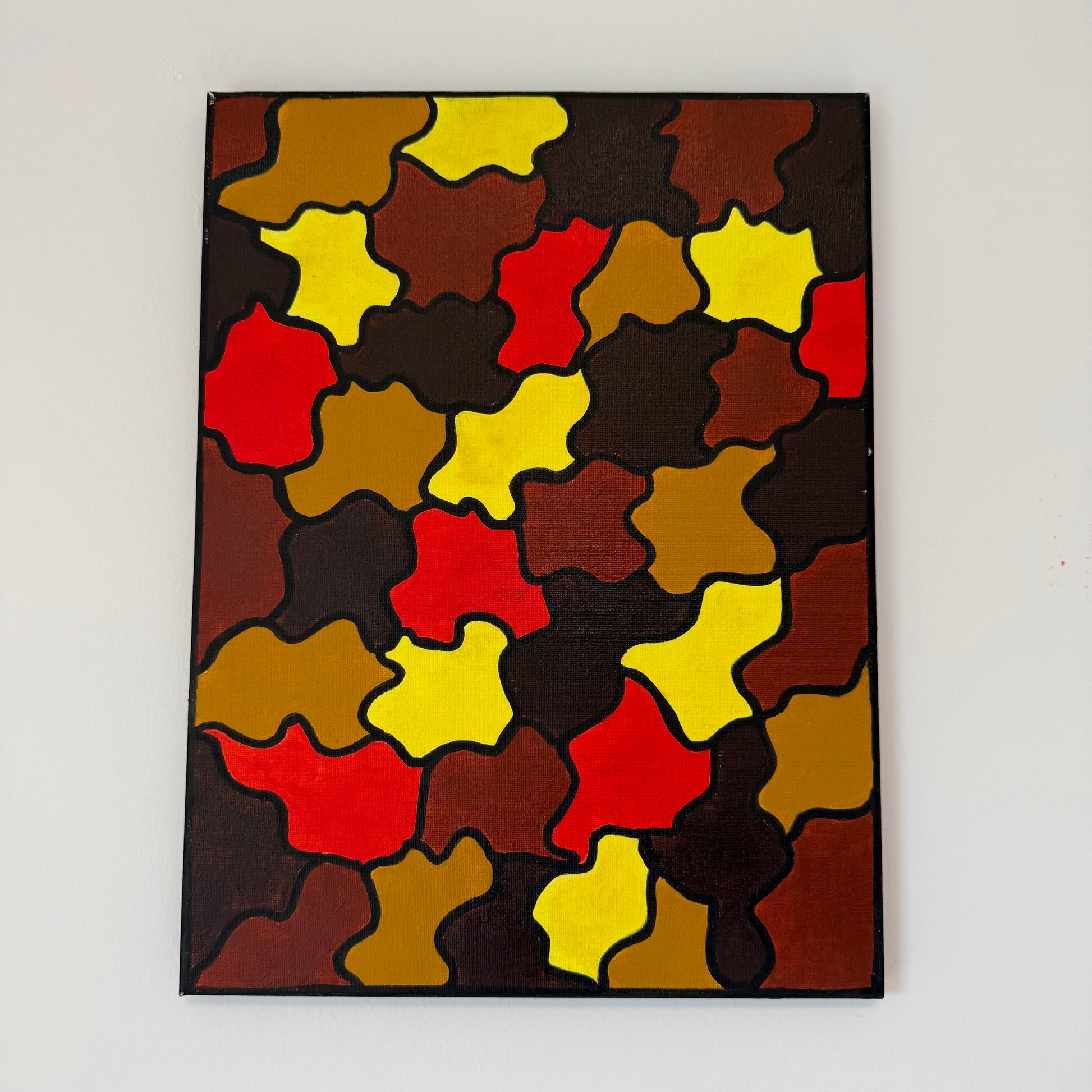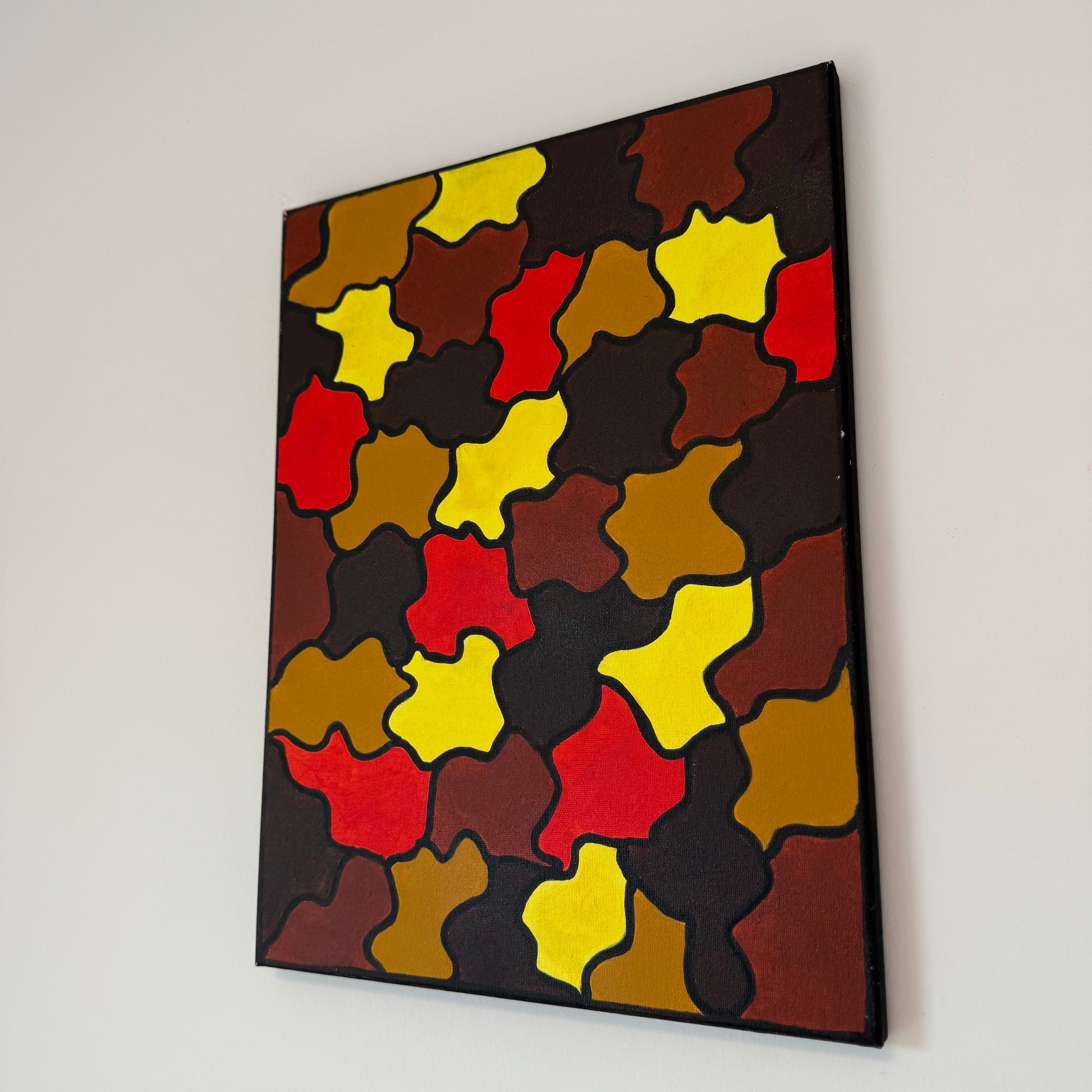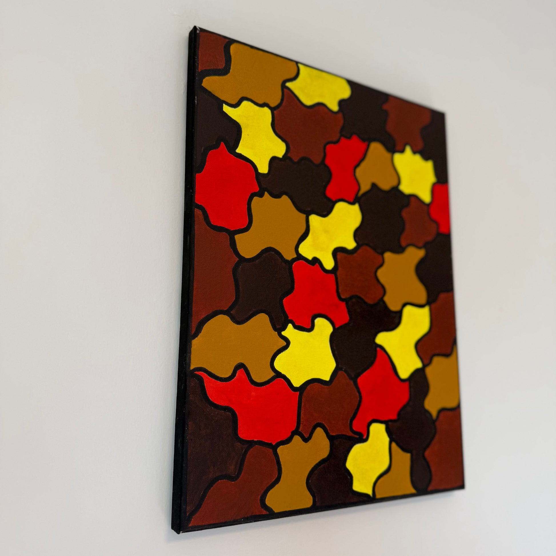 Bold shapes in rich browns, reds, and golds playfully collide, inspired by the warmth and nostalgia of a favorite treat. REESƎS balances repetition and spontaneity — a vibrant, puzzle-like composition that invites joy while hinting at the comfort of familiar flavors and childhood memories.