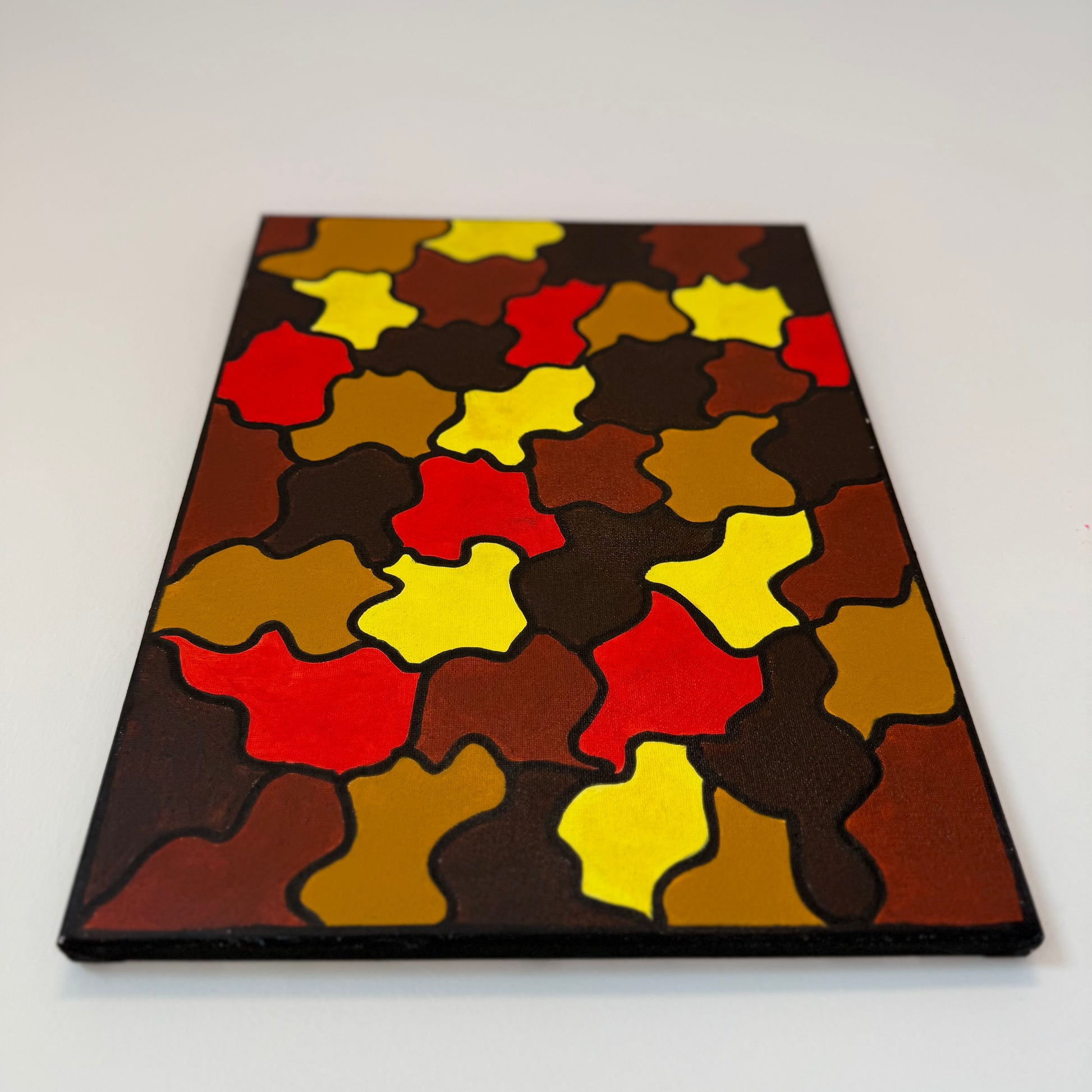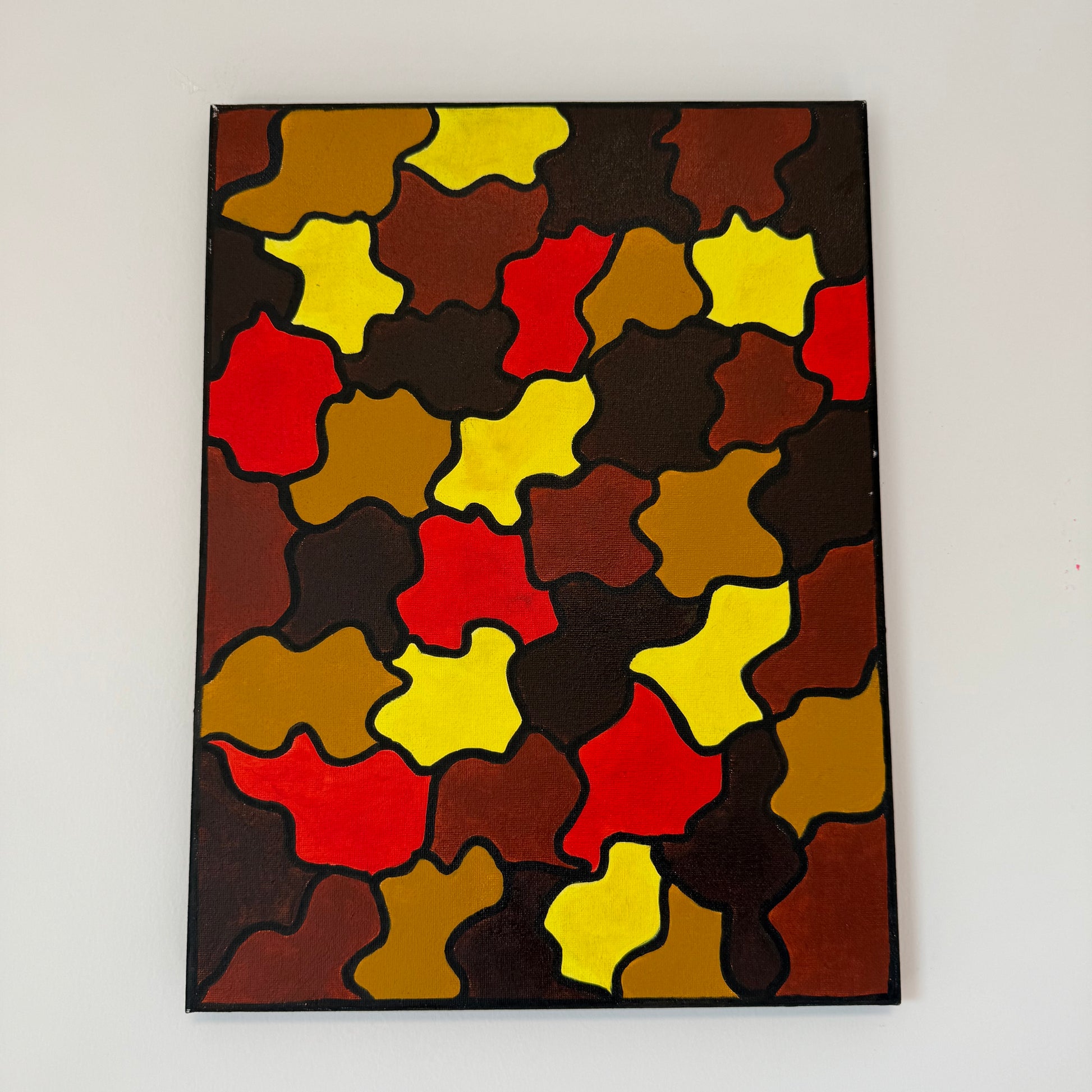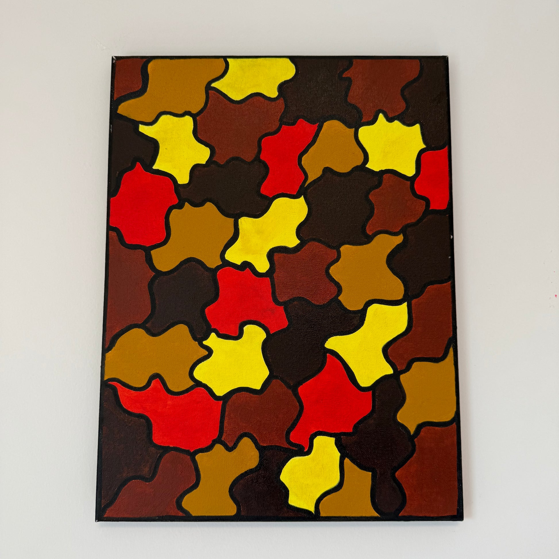 Bold shapes in rich browns, reds, and golds playfully collide, inspired by the warmth and nostalgia of a favorite treat. REESƎS balances repetition and spontaneity — a vibrant, puzzle-like composition that invites joy while hinting at the comfort of familiar flavors and childhood memories.